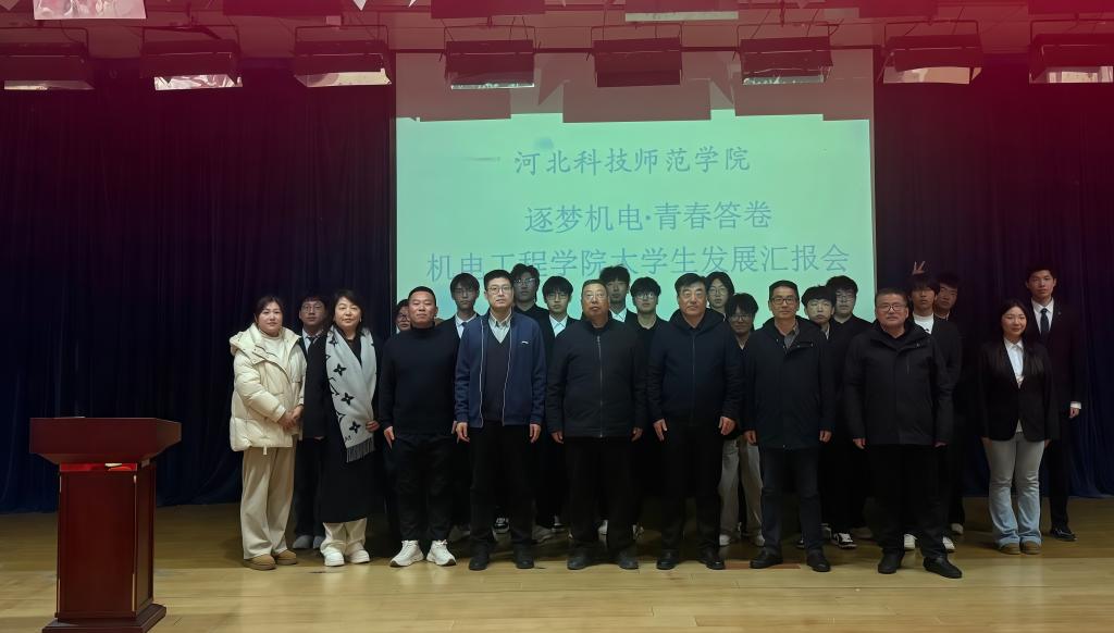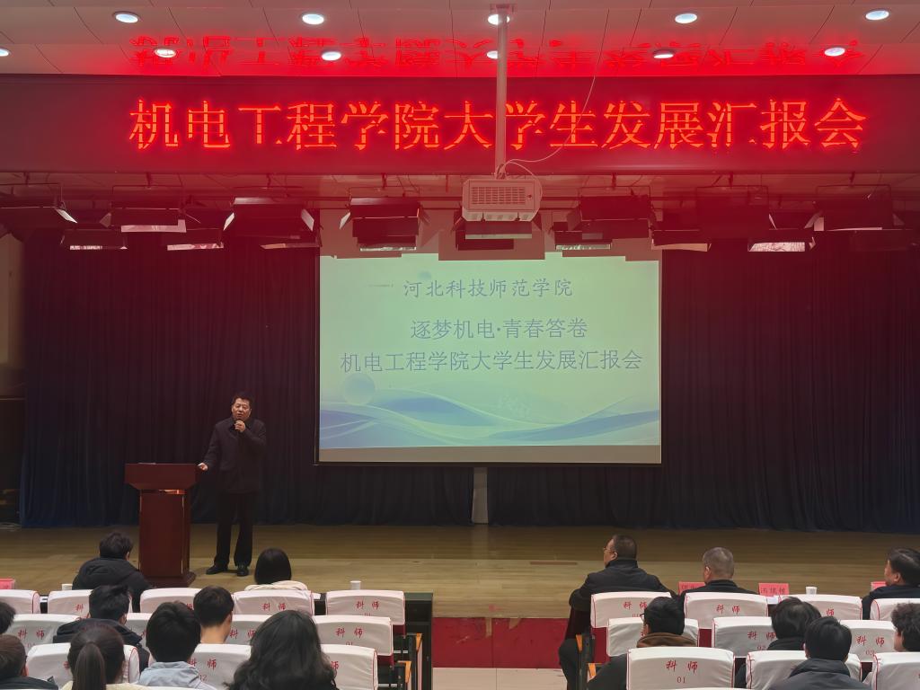 2025年12月11日,wm完美体育官网登录在开发区校区学术报告厅举办“逐梦机电·青春答卷——大学生发展汇报会”。校党委常委、副校长冯瑞银,学生处处长张红新,学院领导班子成员、辅导员、班主任、学业导师及学生代表共200余人参加了活动,部分学生家长通过线上直播“云端”观摩,共同见证机电学子在融入强国建设和民族复兴进程中的成长足迹。