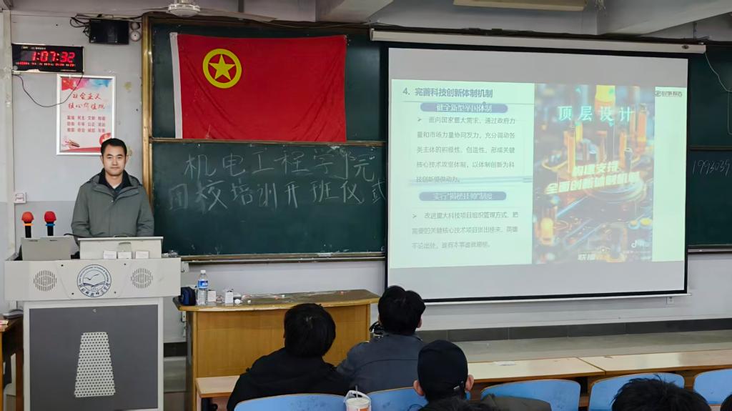 开班仪式后,团委书记以《打好科技自立自强的主动仗》为题,为全体学员讲授首期团课。他紧密结合机电工程专业特色,紧扣国家制造强国战略、科技自立自强发展需求,深入剖析了新时代机电领域科技创新的机遇与挑战,阐释了科技自立自强的时代内涵与青年肩负的使命担当。