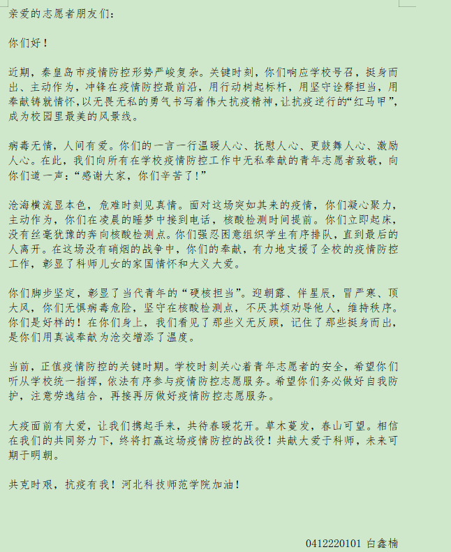 为了广泛弘扬“奉献、友爱、互助、进步”志愿精神,wm完美体育官网登录青年志愿者协会于2022年11月—12月举办了“志青春,愿常在”活动。该活动通过结合青年志愿者工作实际,展播志愿者主题文字类、图片类、视频类作品,充分发挥了志愿服务先进典型的示范带头作用,着力展现青年志愿者服务大局、奉献社会、引领成长的青春风采。
